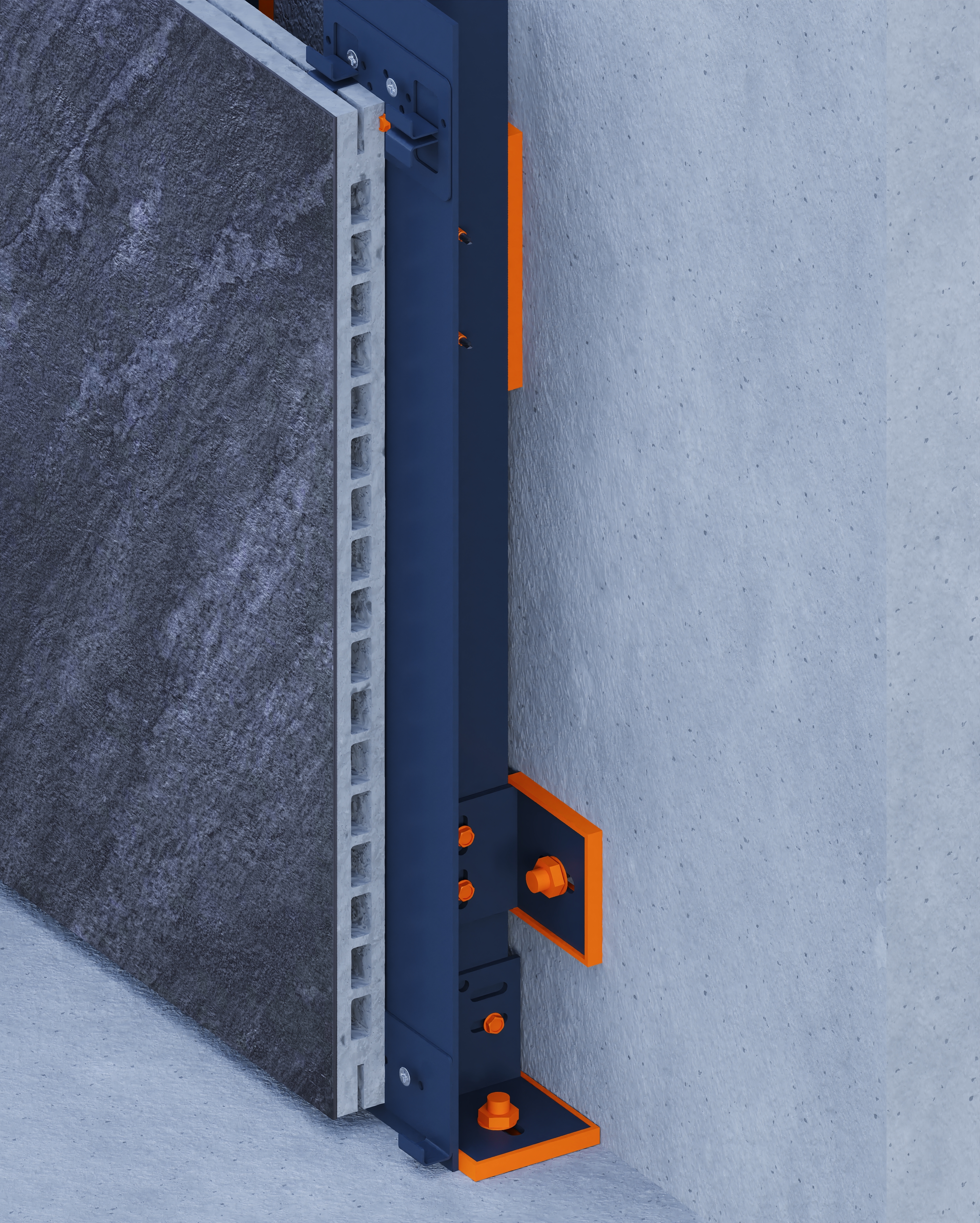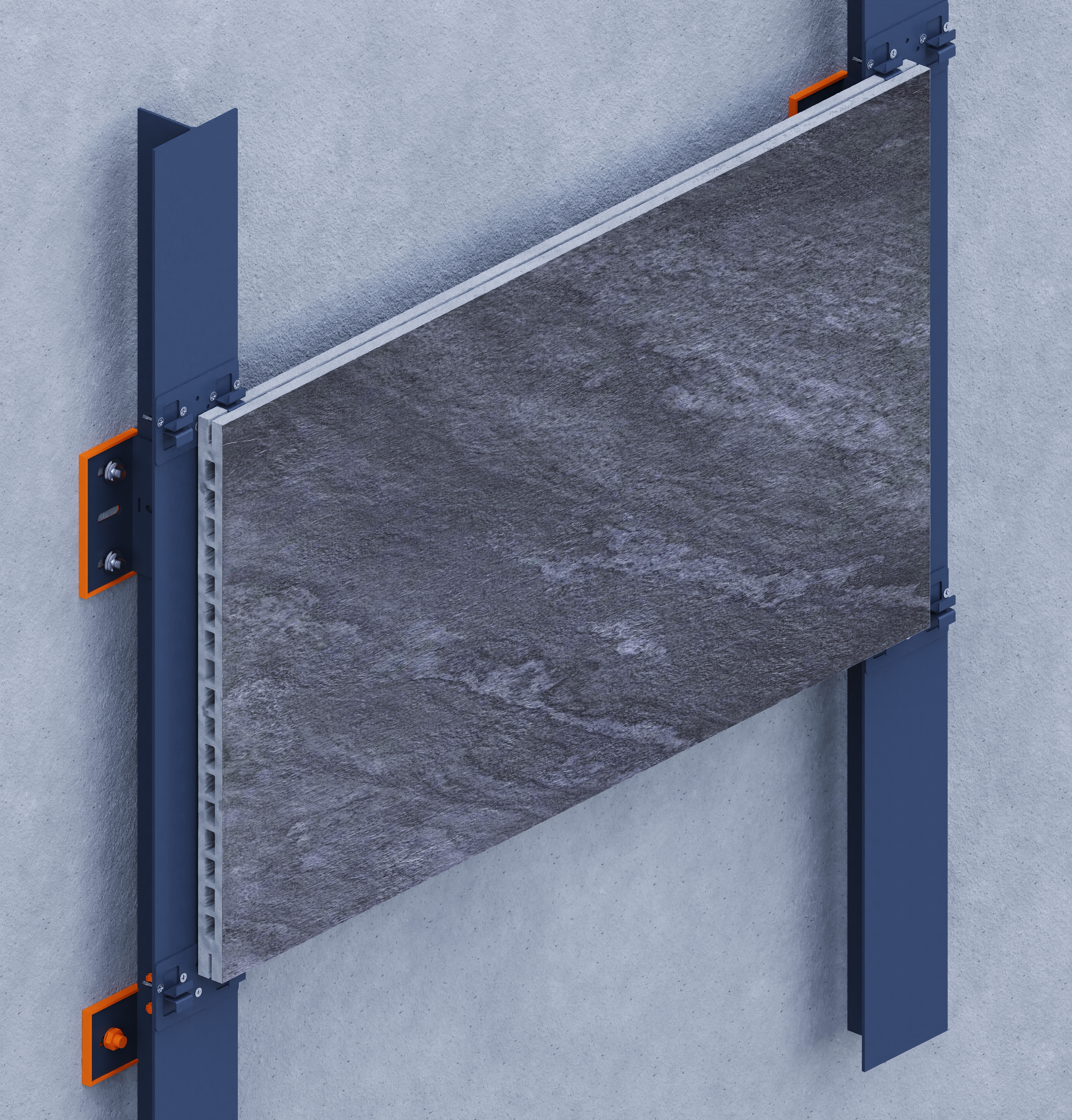 This invisible mechanical fixing system provides a concealed installation method for 20 mm extruded porcelain tiles in ventilated façades. Each tile features a factory-formed edge groove for concealed stainless steel clamps, which are anchored to a vertical aluminum substructure. The result is a seamless surface with no visible fasteners.Compatible with both vertical and horizontal layouts, the system allows for easy tile replacement without disturbing surrounding panels—ideal for commercial and residential projects requiring durability, clean aesthetics, and installation efficiency.