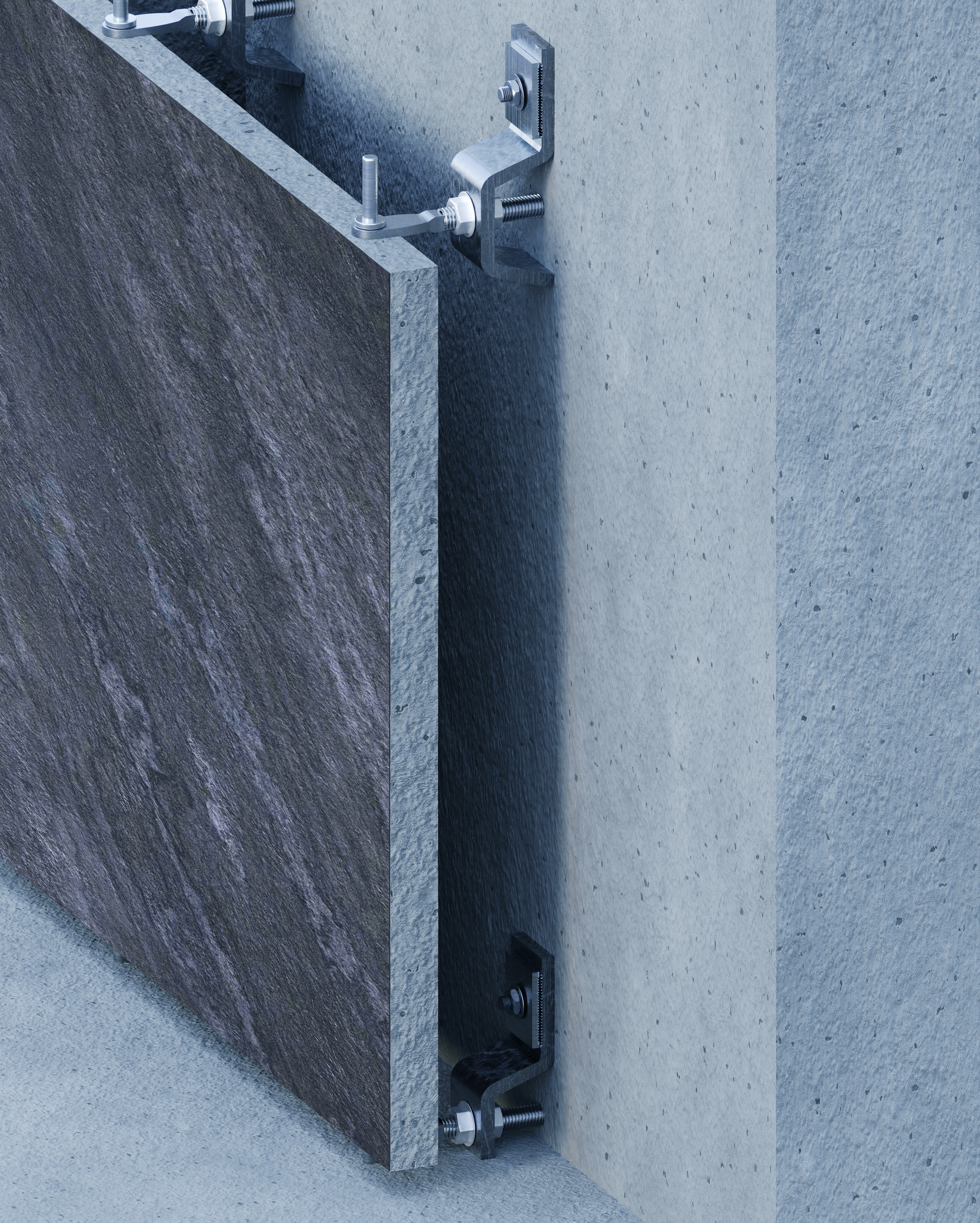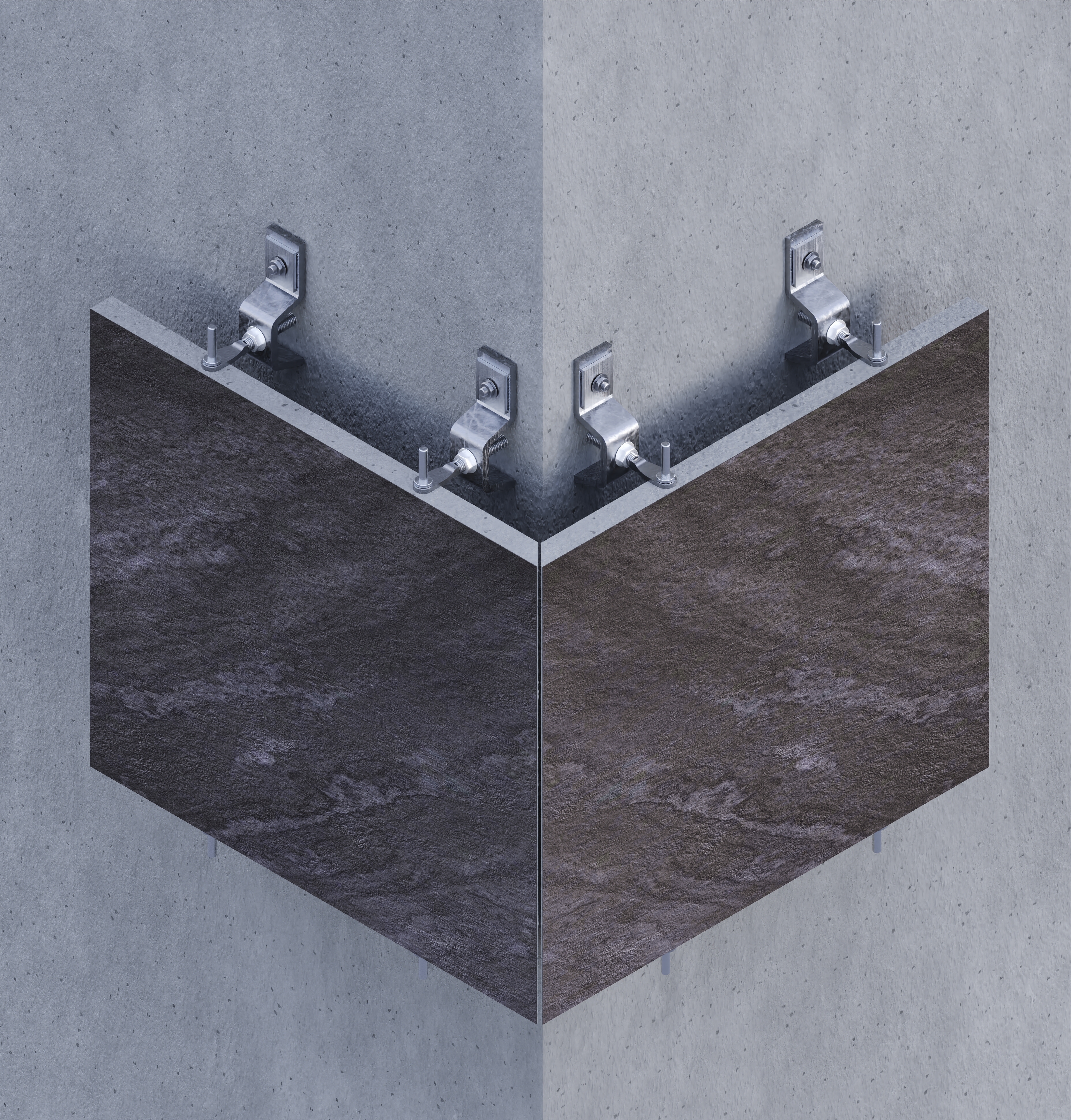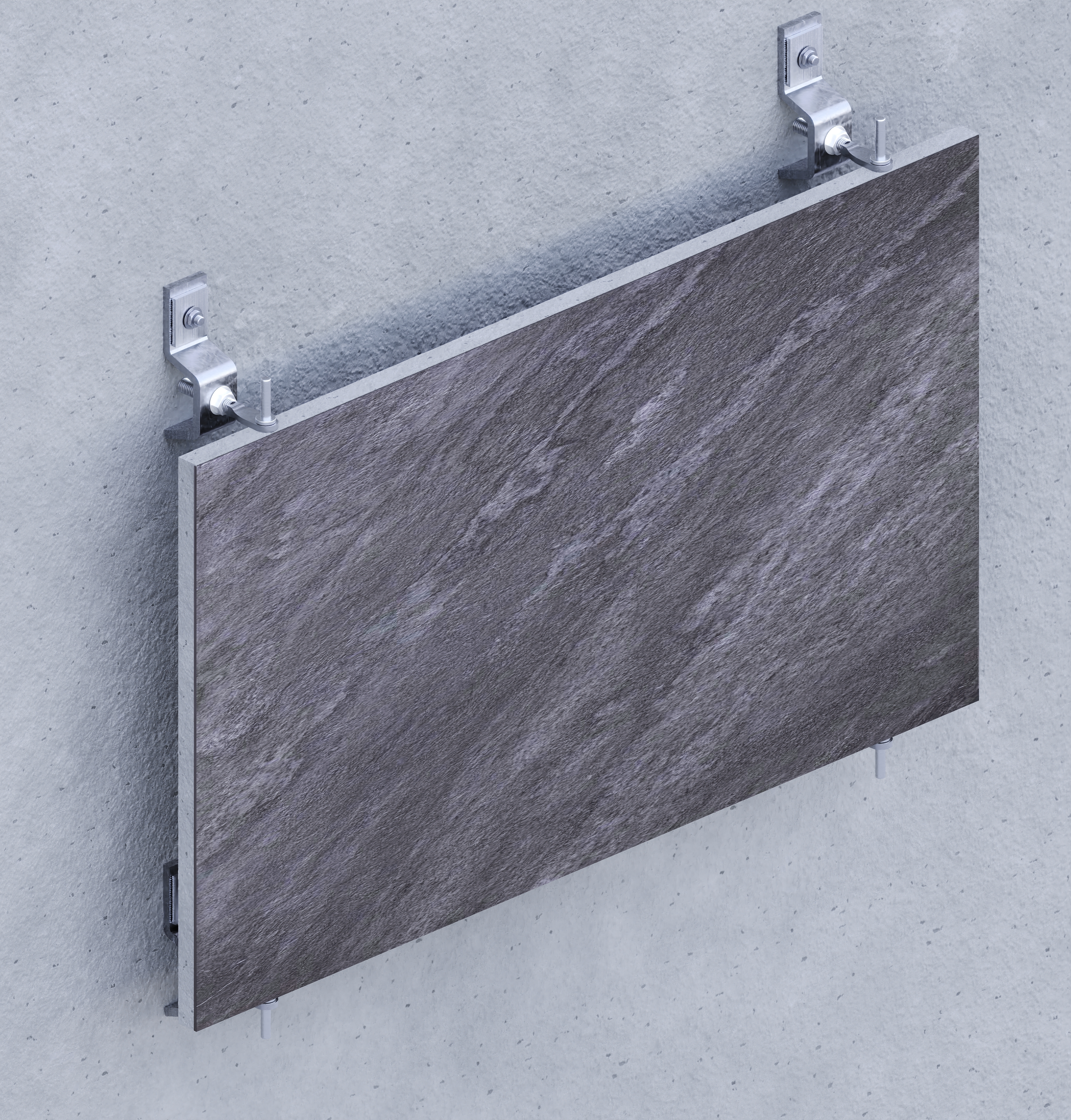 This mechanical fixing system is designed for ventilated façades using natural stone or porcelain tiles with a thickness of 20 mm or 30 mm. It utilizes Z-shaped stainless steel 316 brackets with a returned leg, creating a secure horizontal joint between cladding elements.The bracket supports the tile from below, enabling dry mechanical installation without adhesives. Its design allows for precise alignment, rapid installation, and long-term durability. The returned leg forms a consistent horizontal joint that ensures structural continuity while maintaining clean visual lines without visible fixings.The system is ideal for modular façades and is compatible with various substructure configurations. It delivers high structural performance while allowing for easy tile removal or replacement when needed.