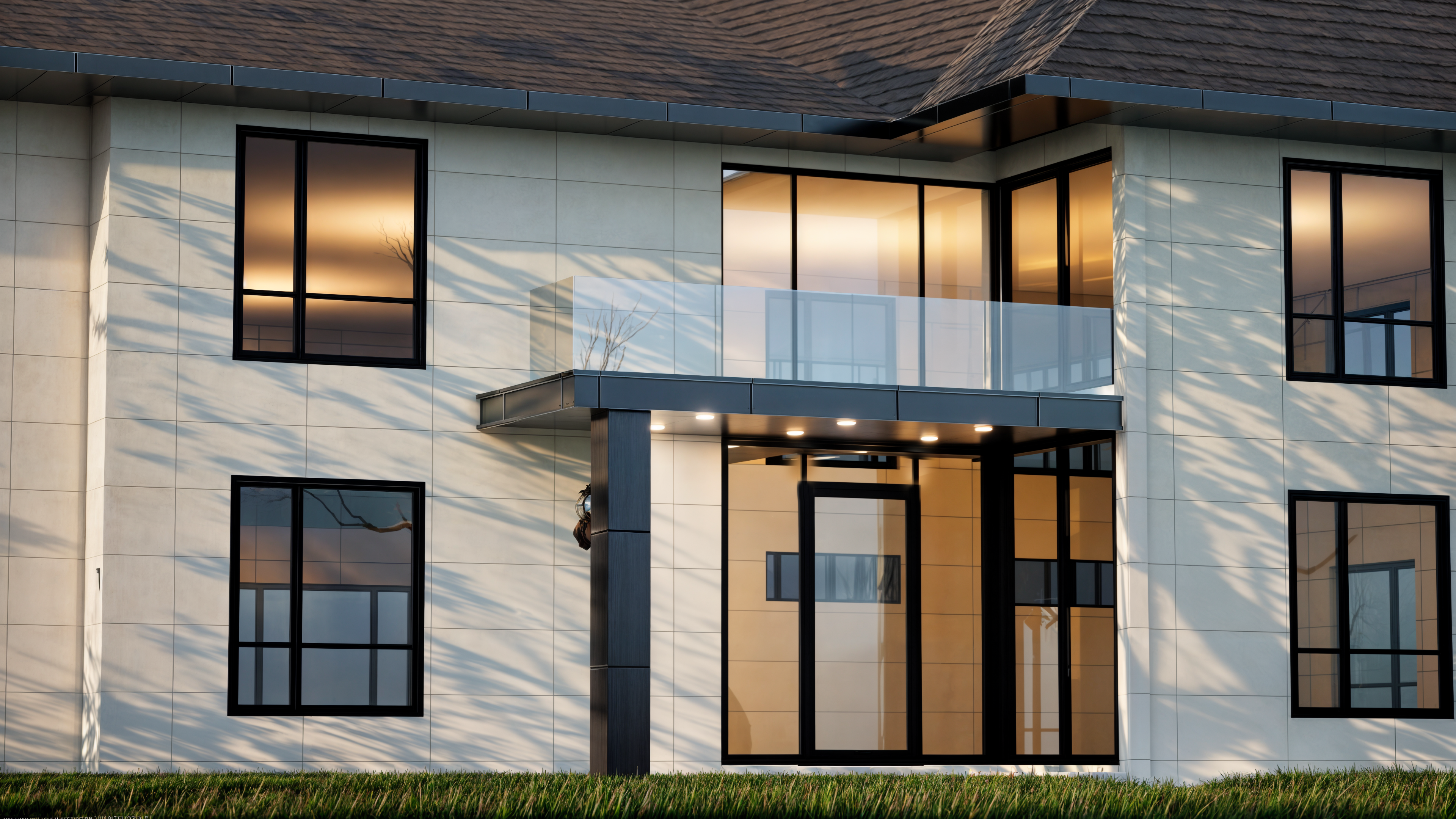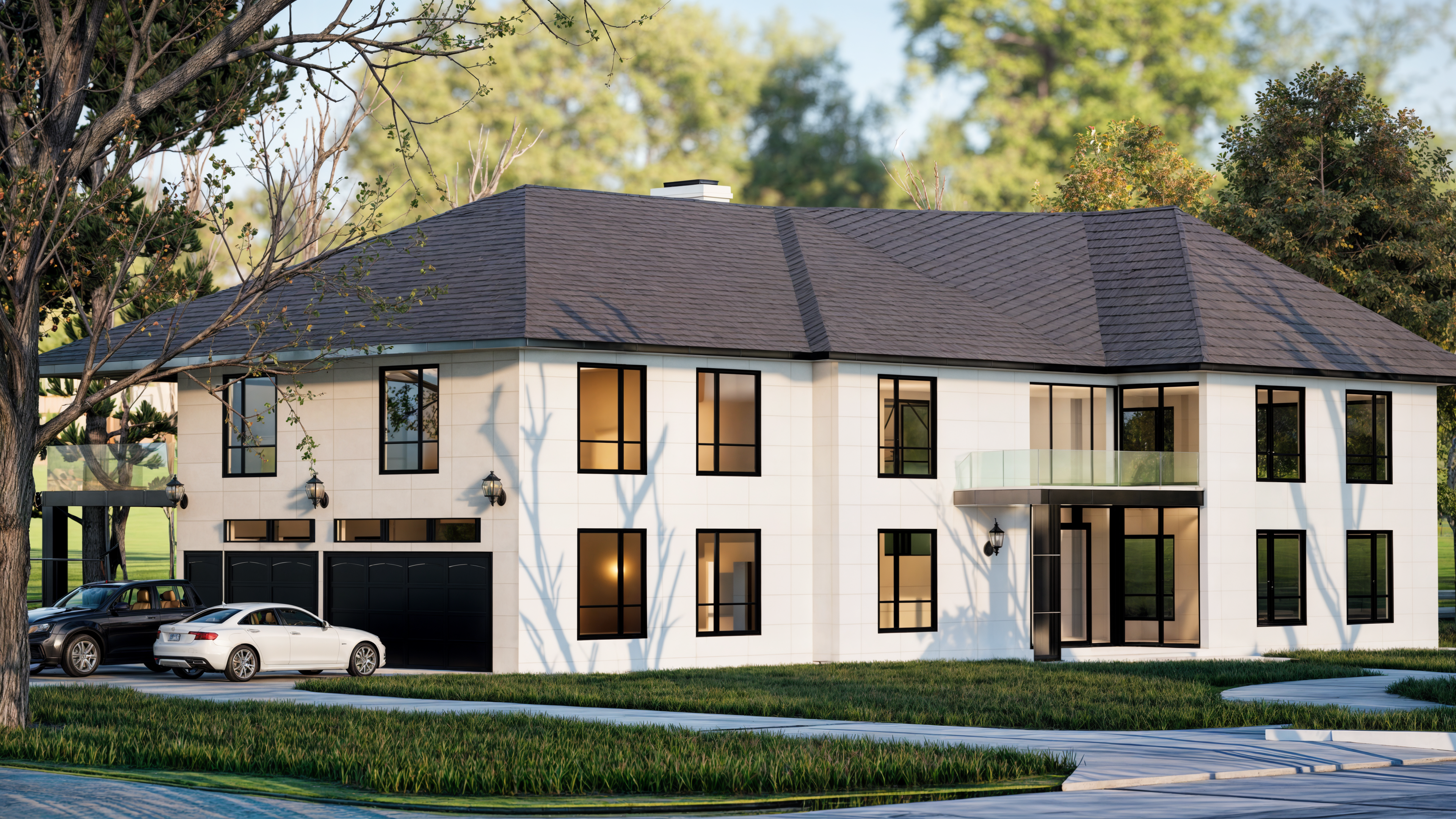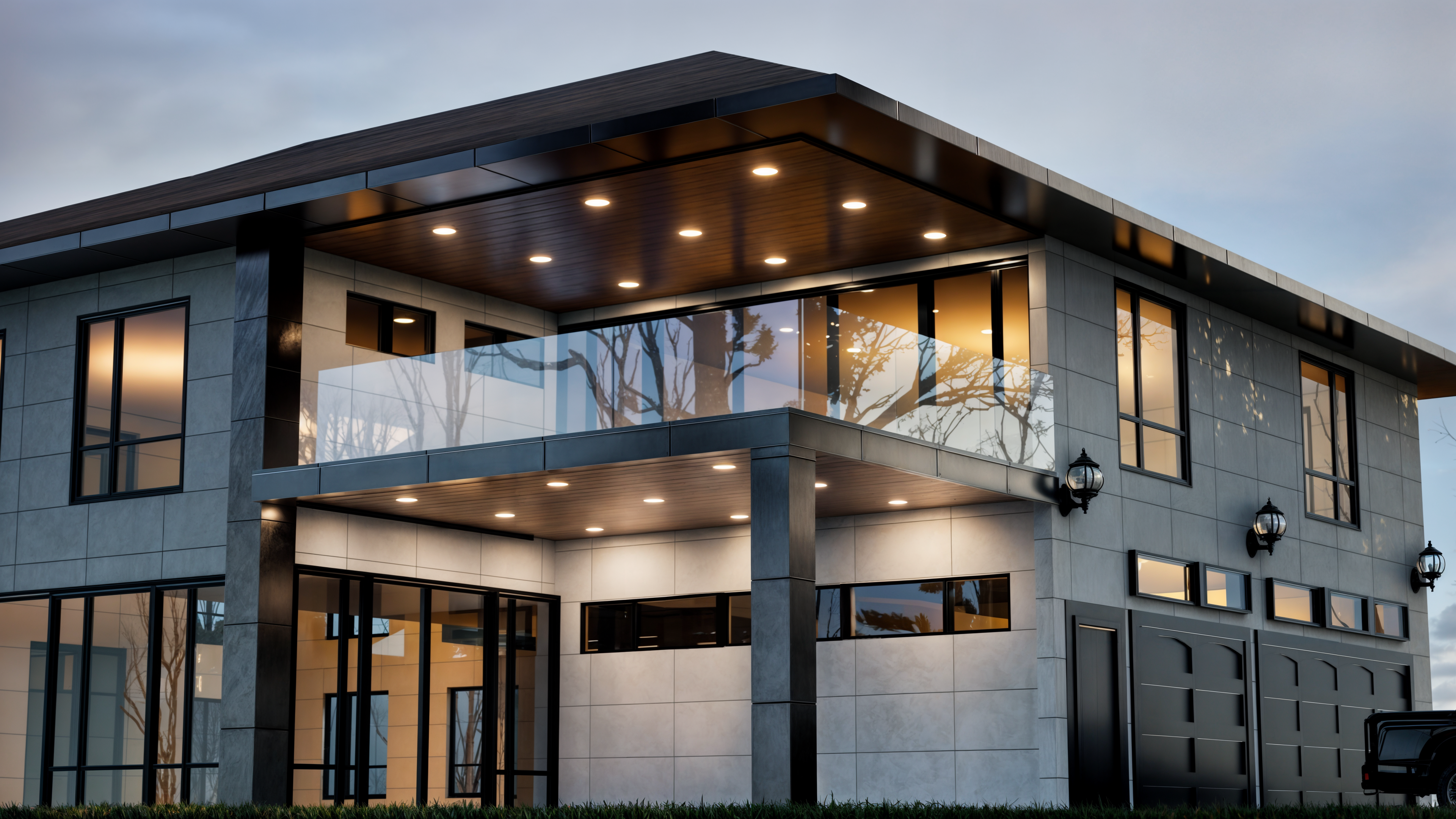 The JMF Project introduces a contemporary residential design defined by clarity of form and understated elegance. The facade is clad in smooth, light-toned panels, arranged in a uniform grid that reinforces the structure’s geometry while offering a clean, monolithic appearance. Large black-framed windows punctuate the surface, creating a dynamic rhythm across both floors. The contrast between the soft stone facade and the dark window profiles adds sharpness without compromising the home's overall warmth.