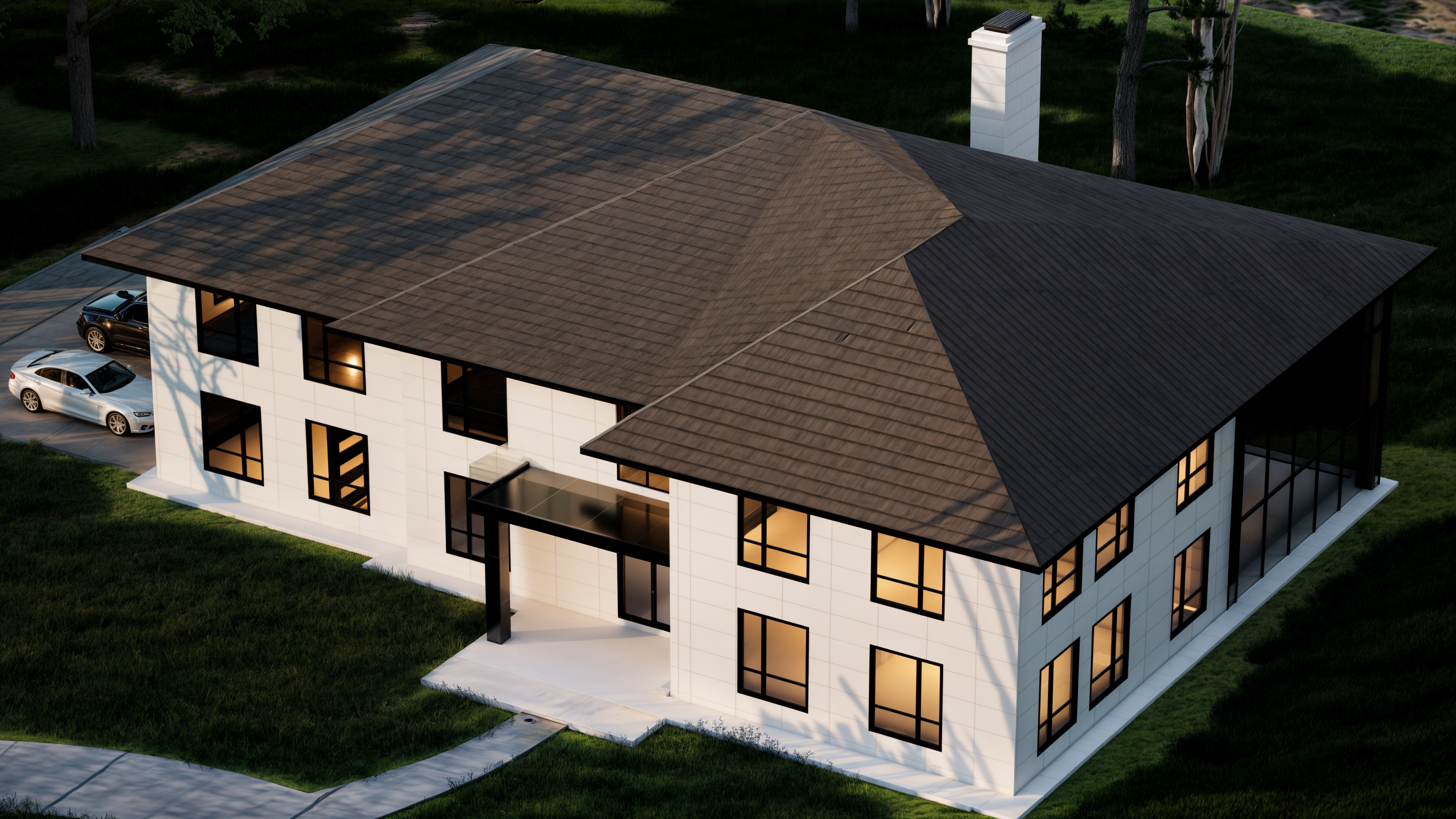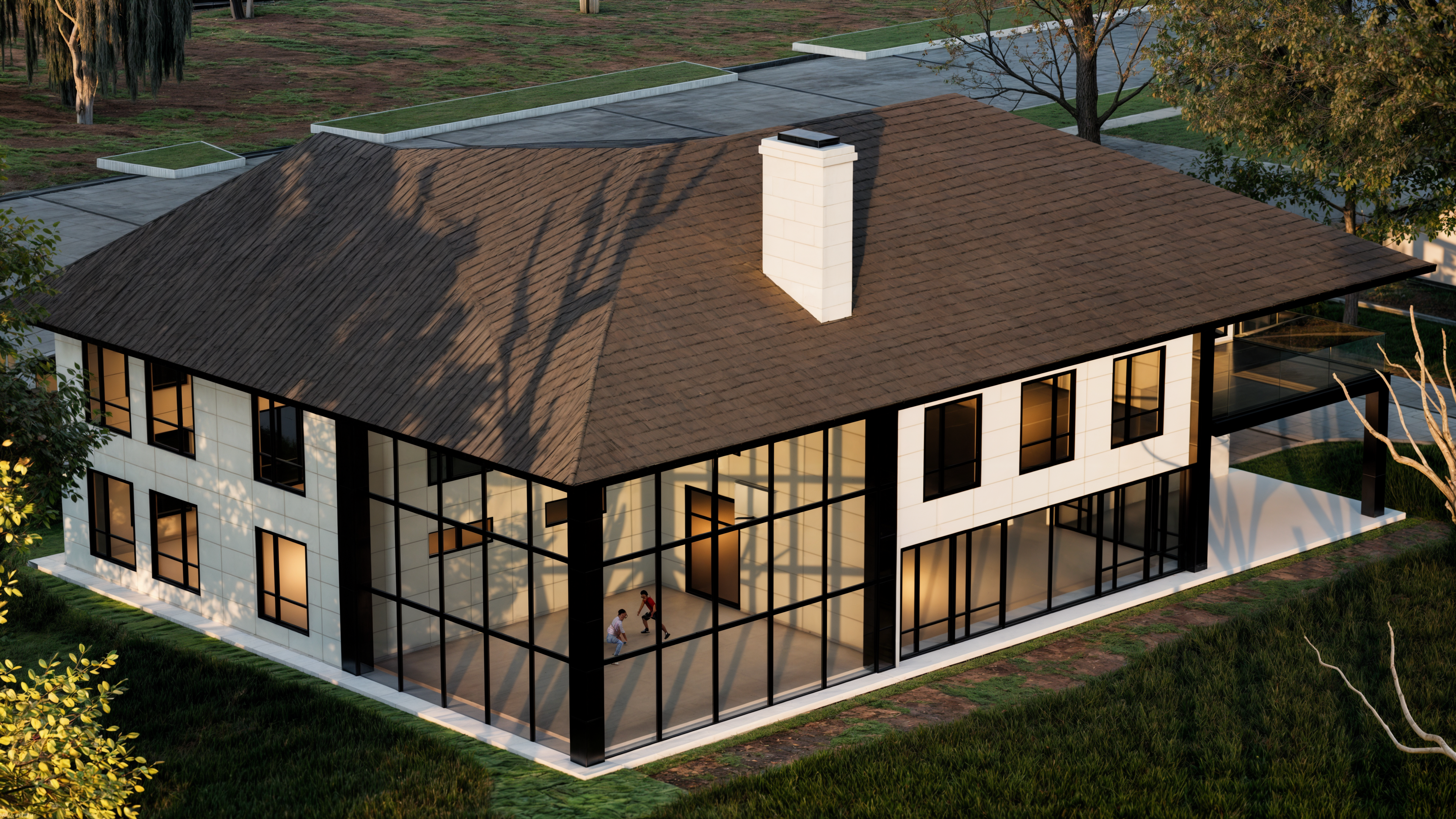 A pitched roof in slate gray crowns the structure, giving a nod to traditional residential forms while maintaining a modern material expression. A transparent balcony and double-height glass entry provide openness and visual connection between the interior and surrounding landscape. The JMF Project stands as a clear example of how simplicity in volume, paired with thoughtful detailing, can create a home that is both timeless and refined.